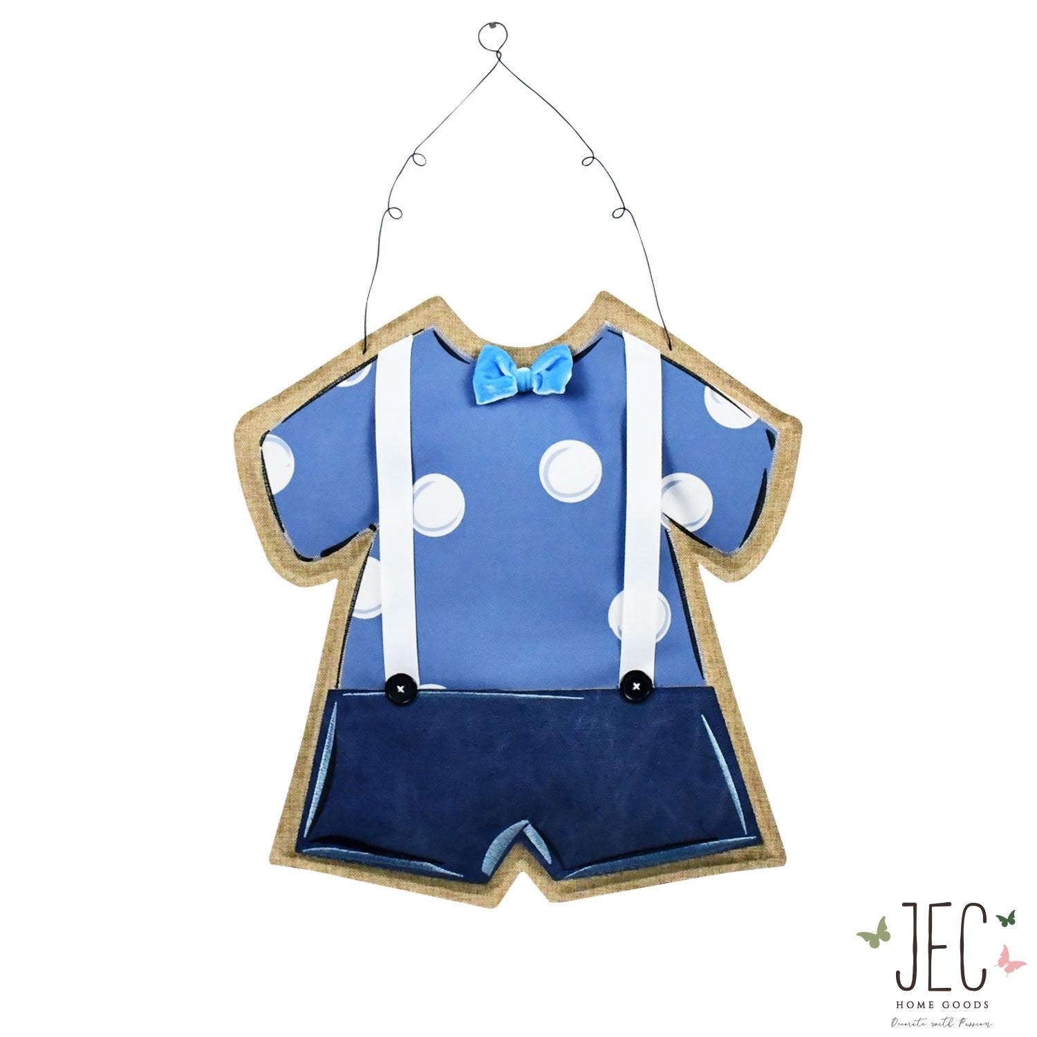 This baby gender reveal door hanger is shaped like a perfect little onesie complete with dashing outfits
