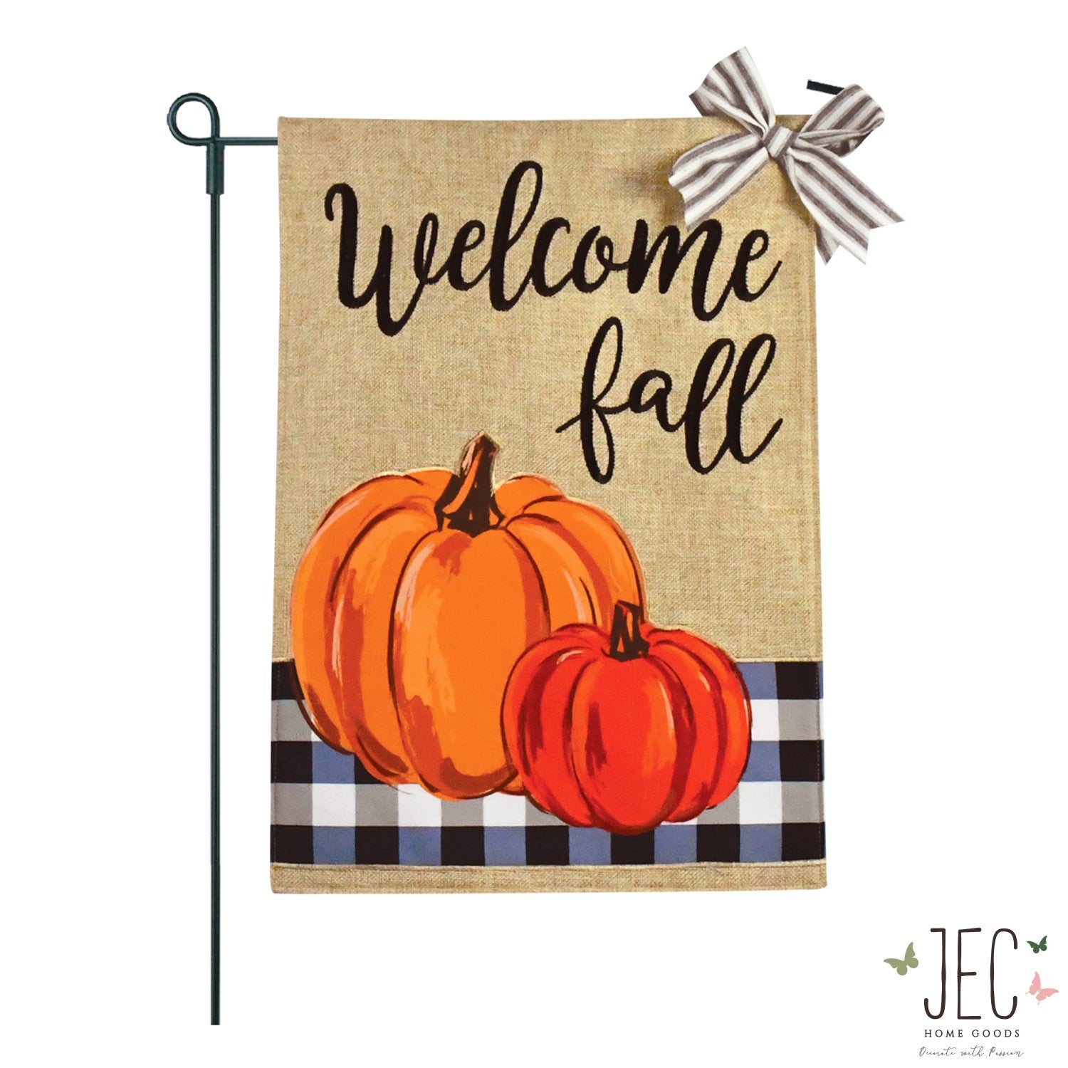 This cute and festive fall flag pictures two brightly colored pumpkins sitting on a blue and white buffalo plaid blanket