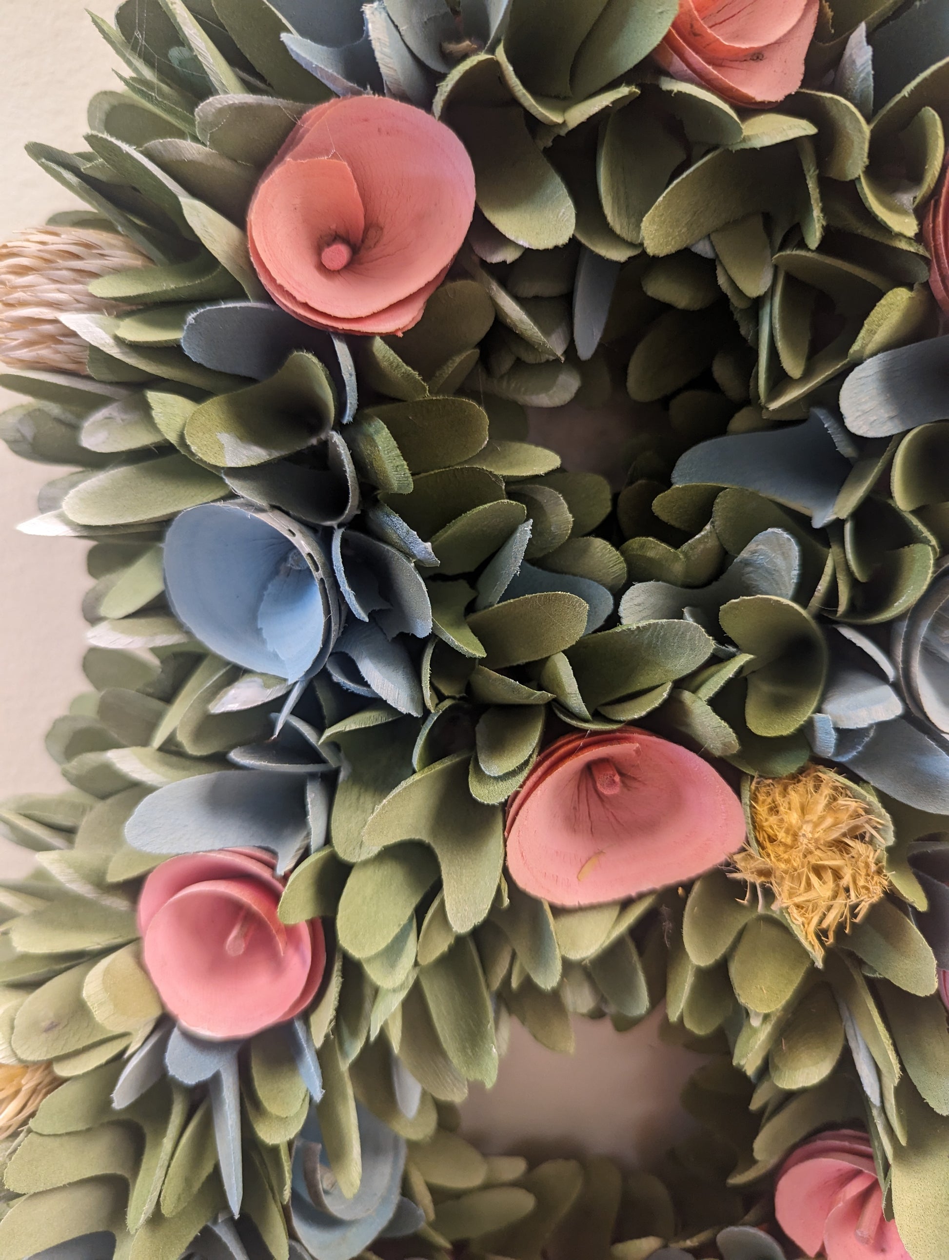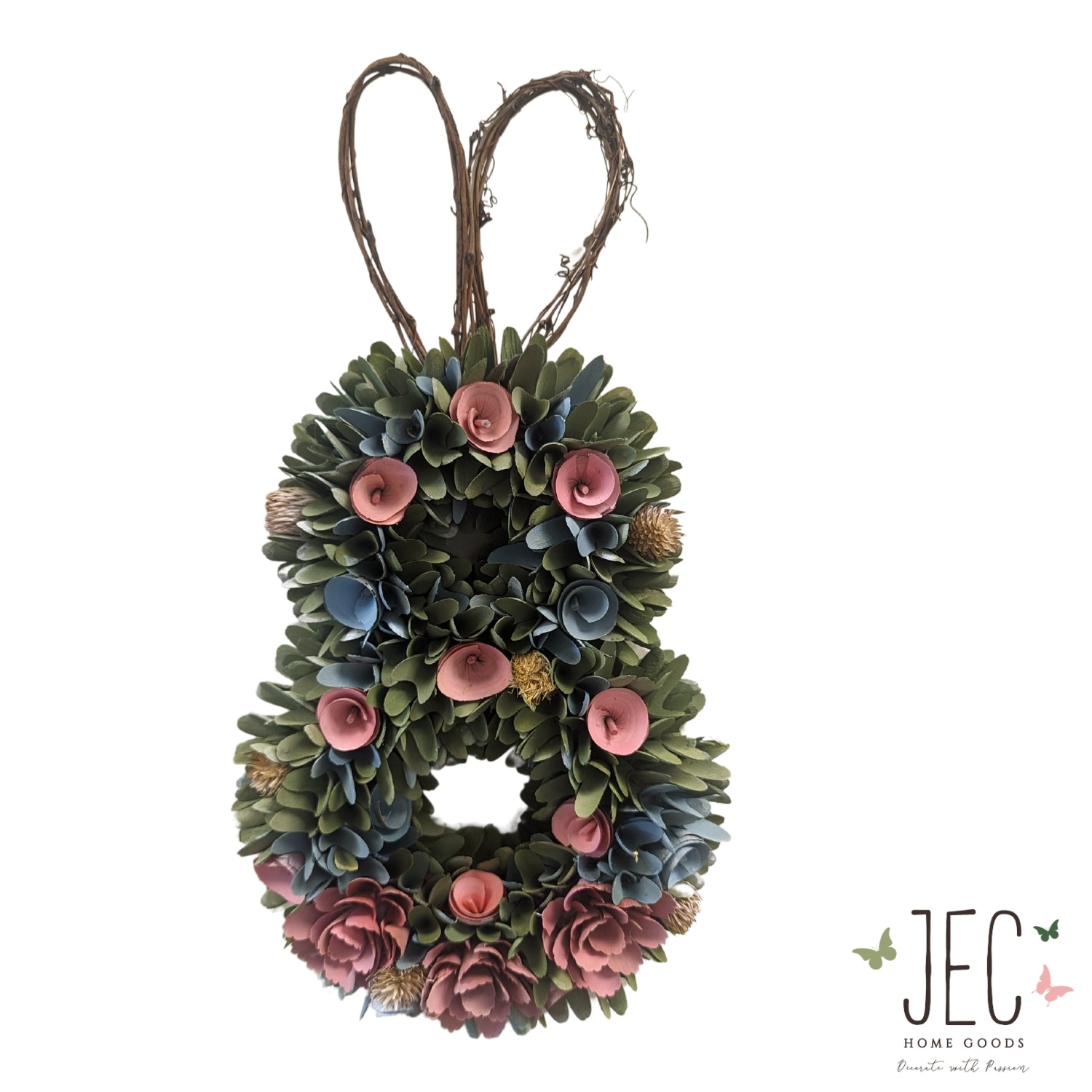 Hop into spring with our Bunny Shaped Wood Curl Floral Wreath! This whimsical wreath features delicate floral accents made from real wood curls in the shape of an adorable bunny. Add a touch of charm to your home decor with this unique and playful piece. (Don't fur-get to hang it on your door!)
