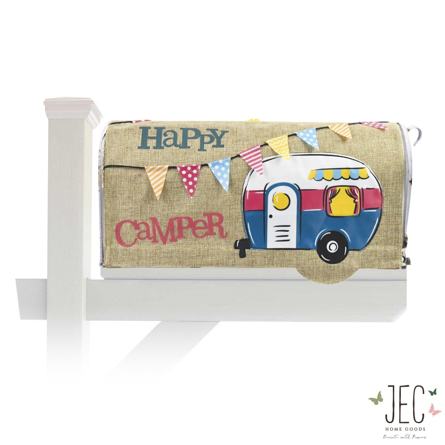 The cutest little camper mailbox cover for a happy camper, adorned with festive and colorful buntings