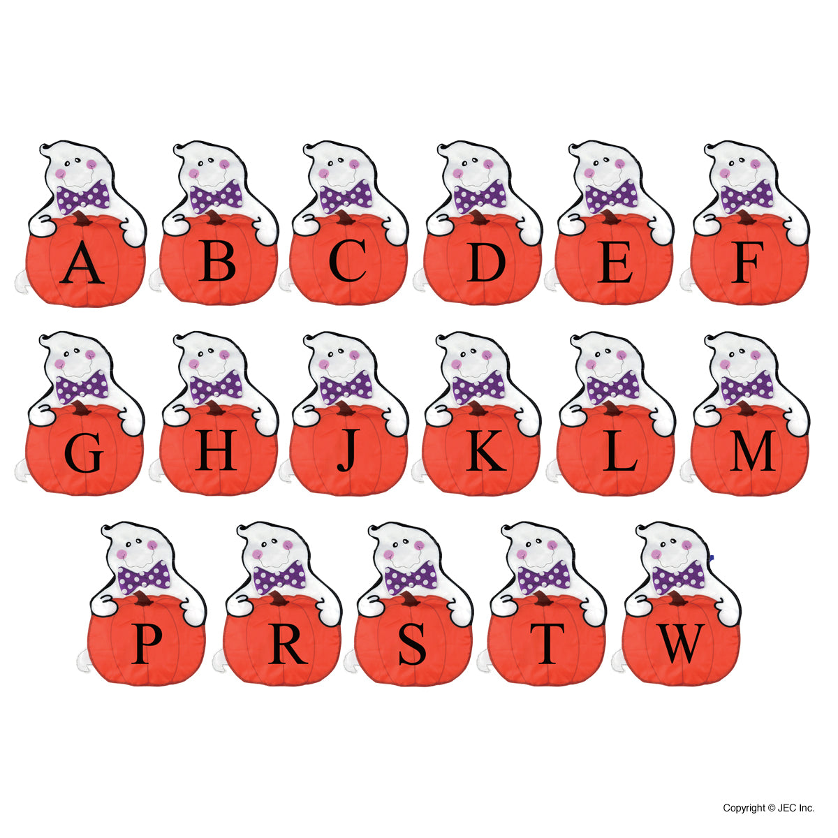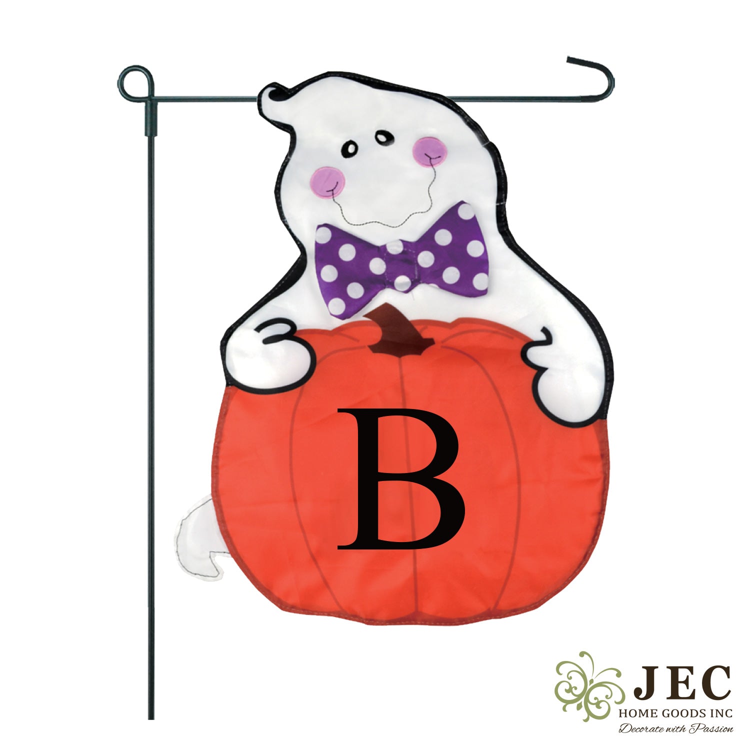 Playful ghost holding monogrammed pumpkin that give Halloween-y welcome
