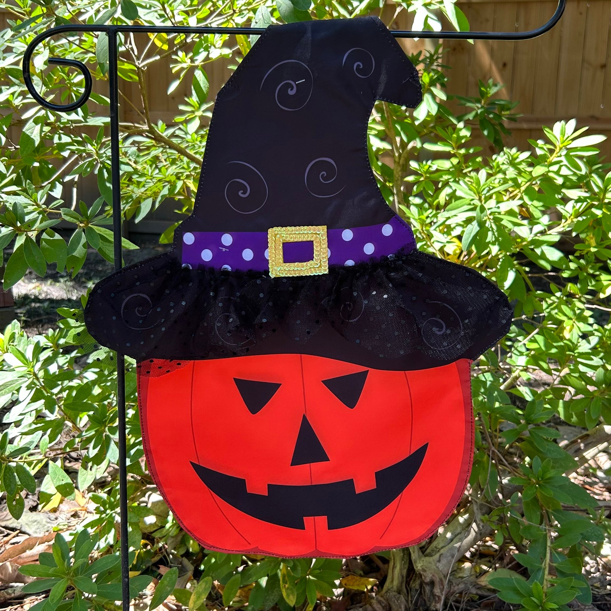 This festive jack o lantern wearing a witches hat flag is perfect for anywhere in your yard to celebrate the Halloween season