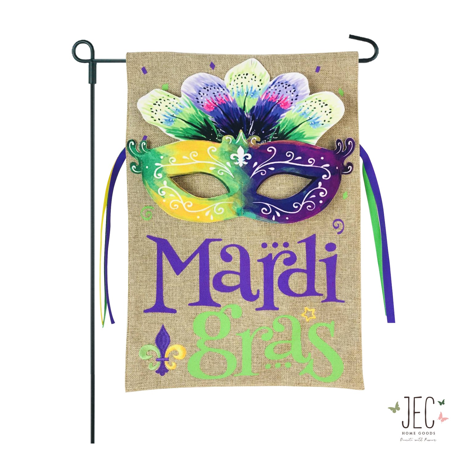 Add a touch of whimsy to your garden with our Mardi Gras Watercolor Mask Burlap Garden Flag. Vibrant watercolor design captures the spirit of celebration. Double-sided, durable, and weather-resistant. Perfect for displaying during the Mardi Gras season, this flag is sure to be a hit at all your parties!