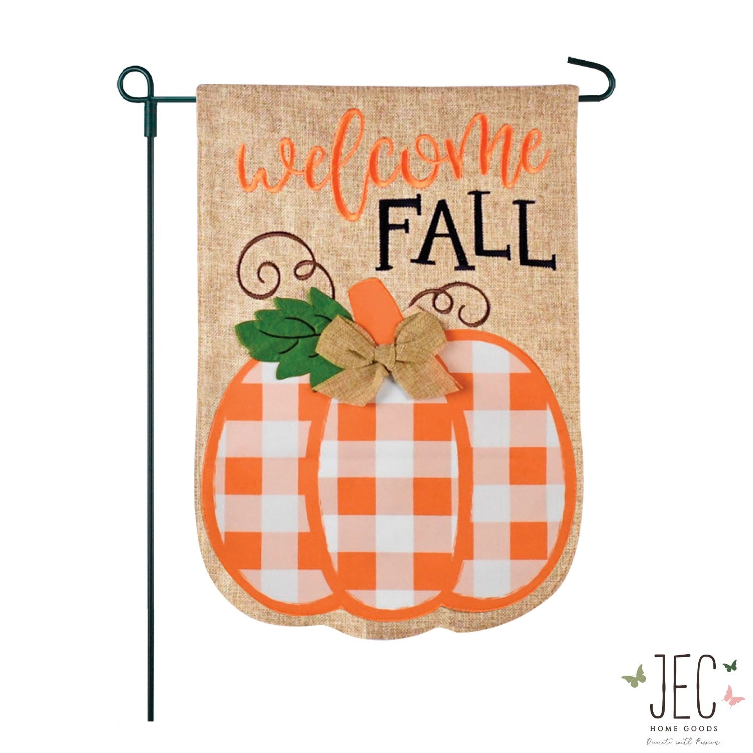 - Orange and white buffalo plaid pumpkin is appliqued on a high quality burlap flag