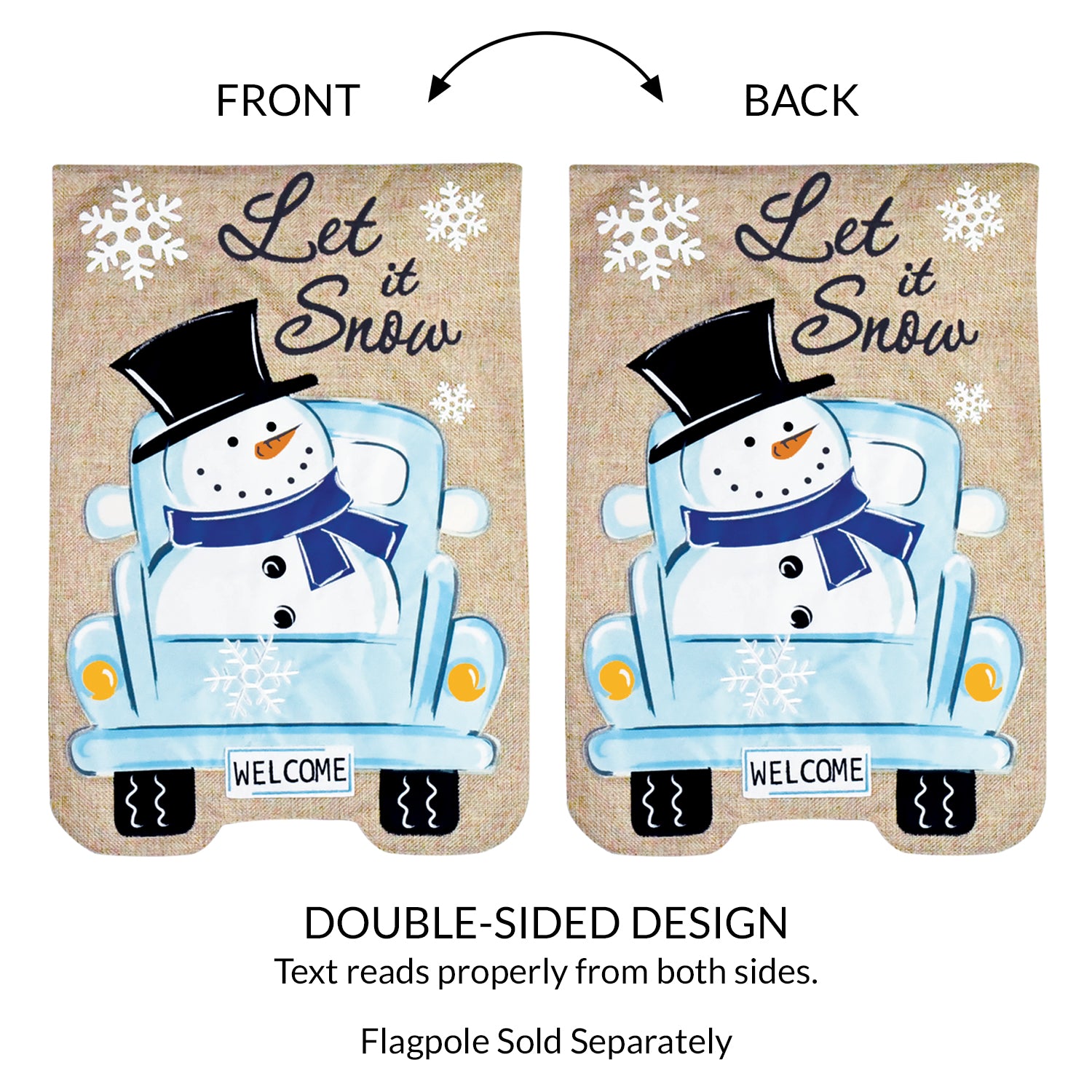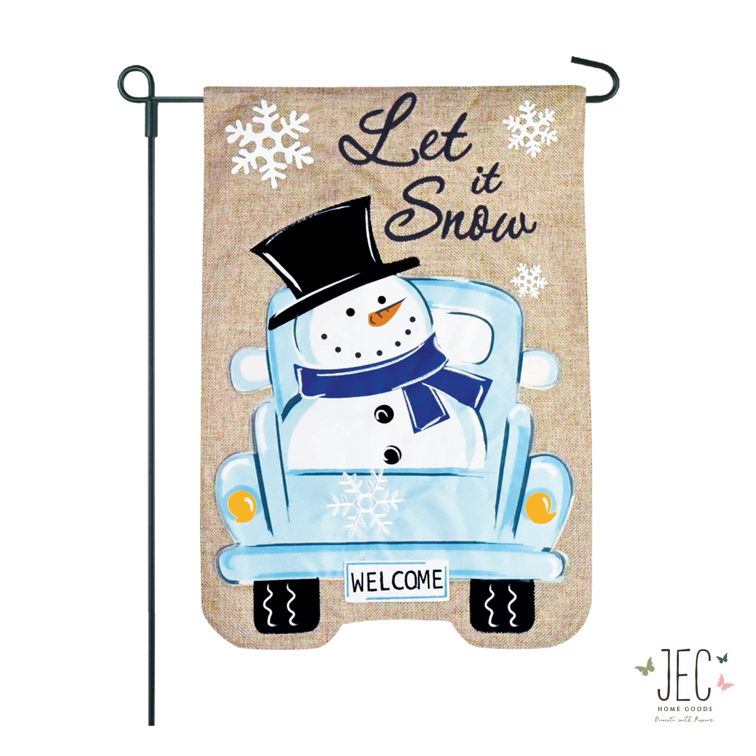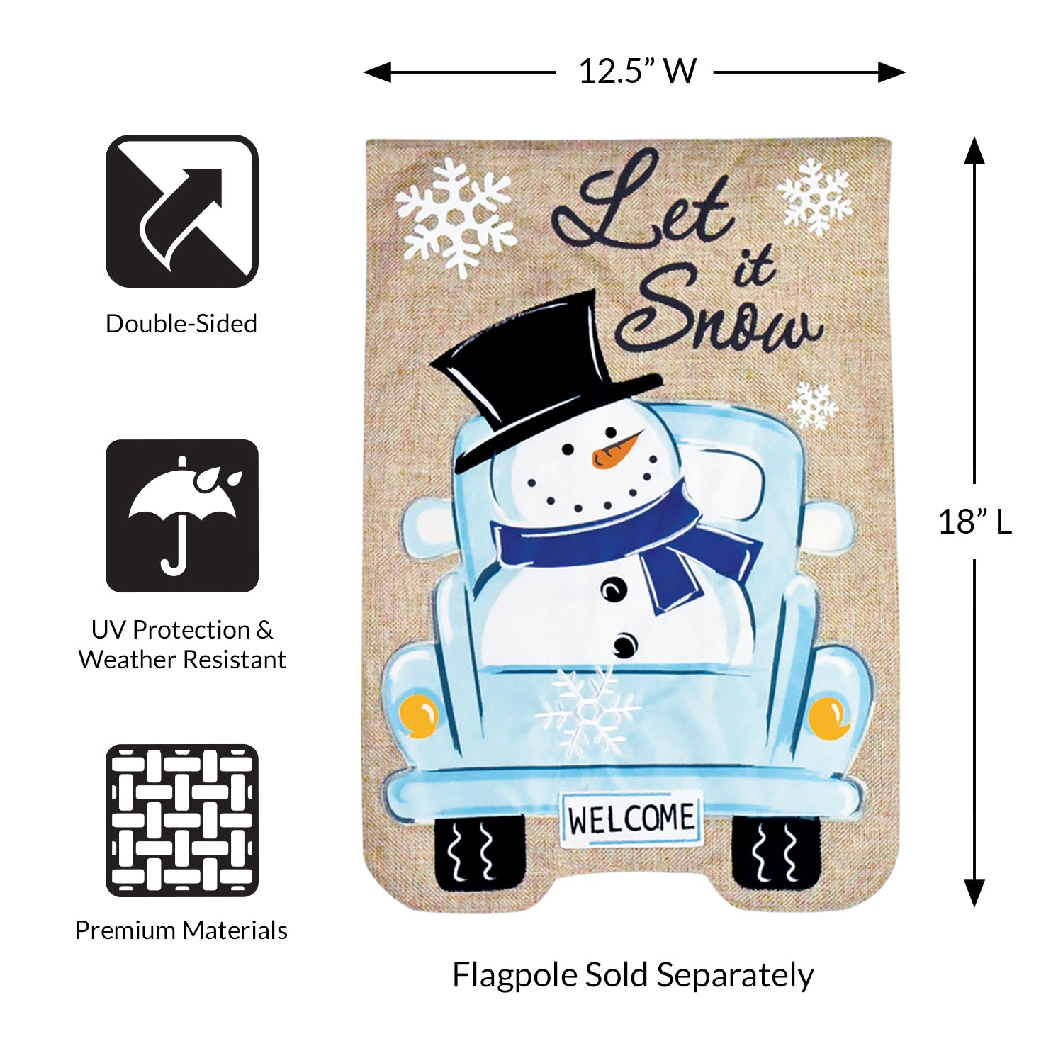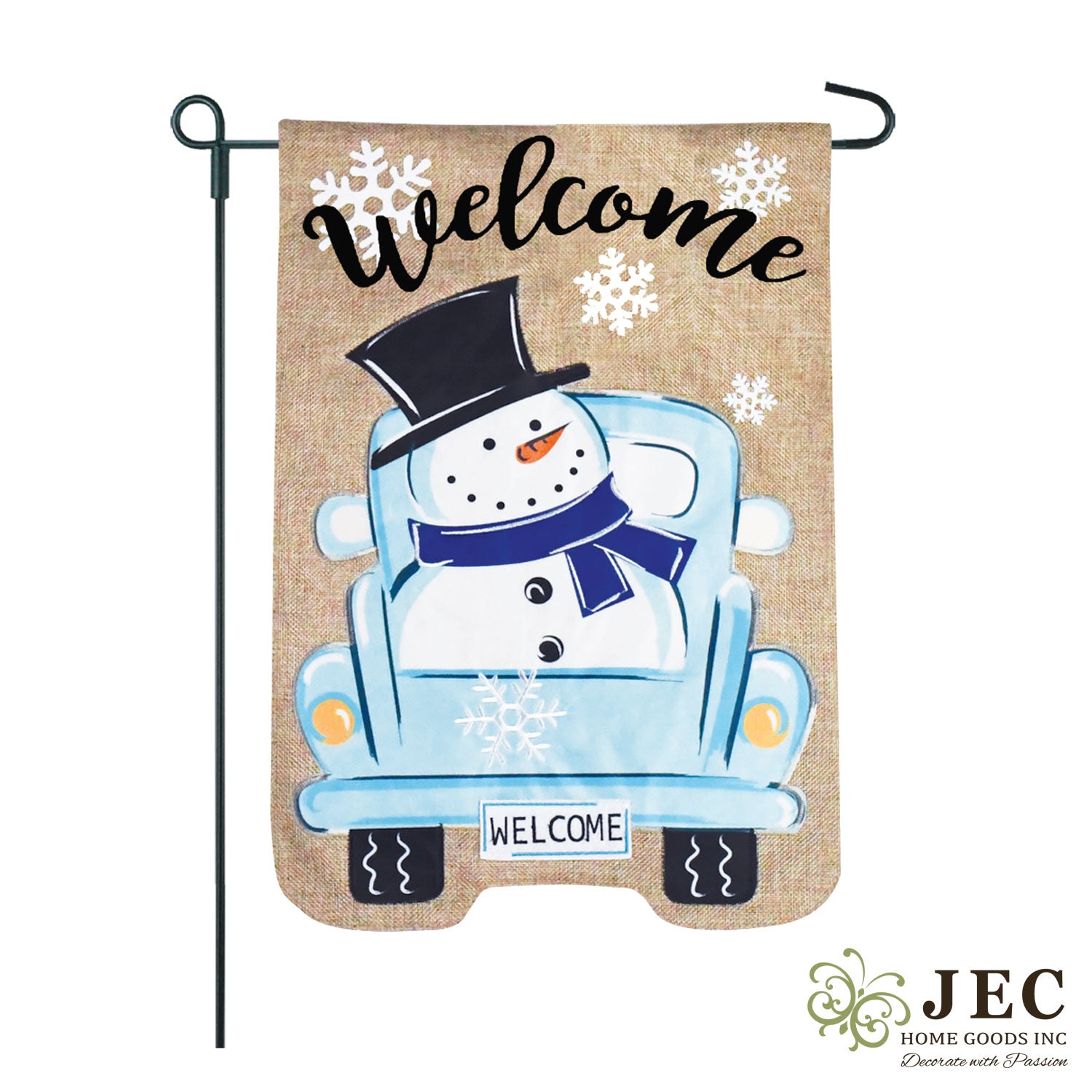 Adorable garden flag featuring a whimsical snowman riding in a vintage blue truck embroidered with "welcome" on the license plate.