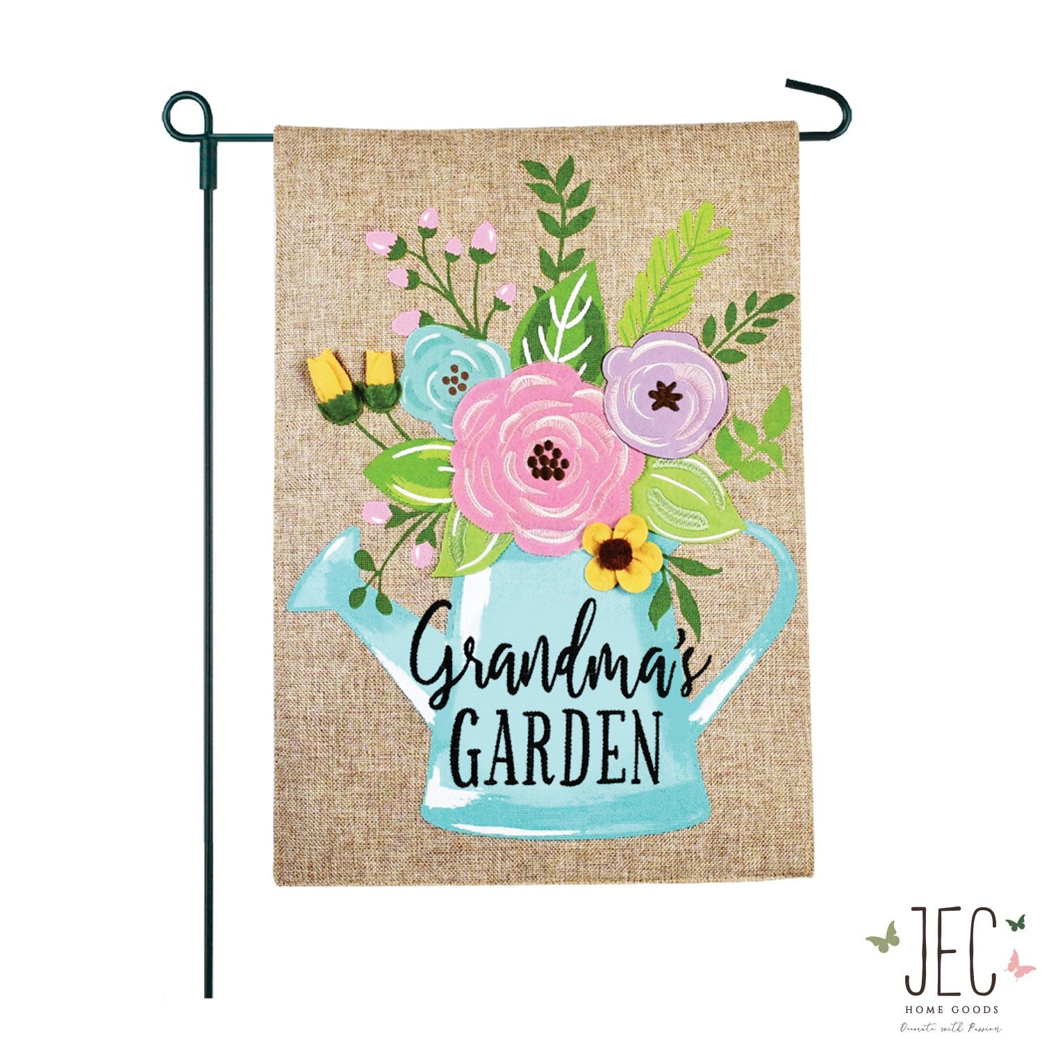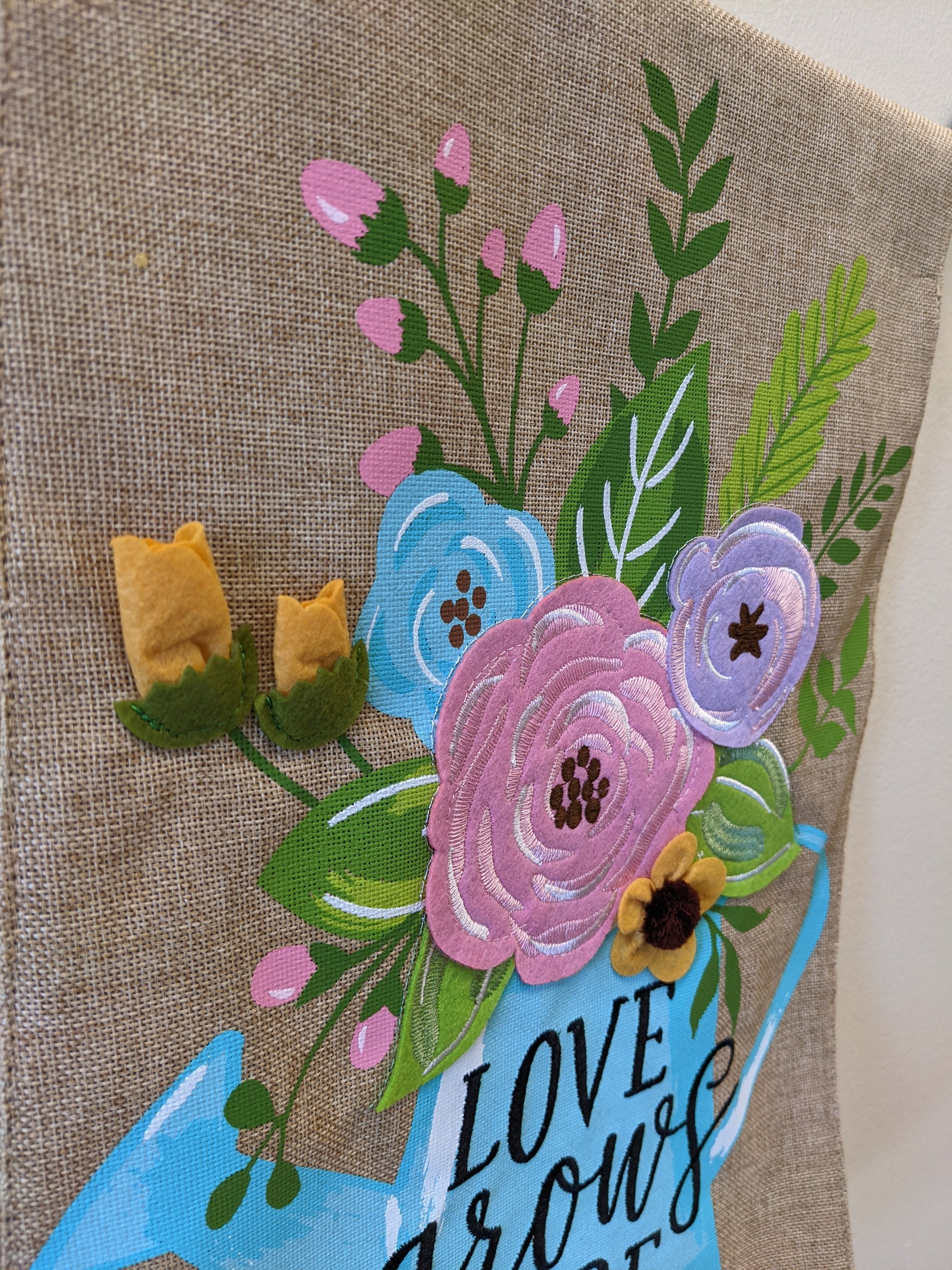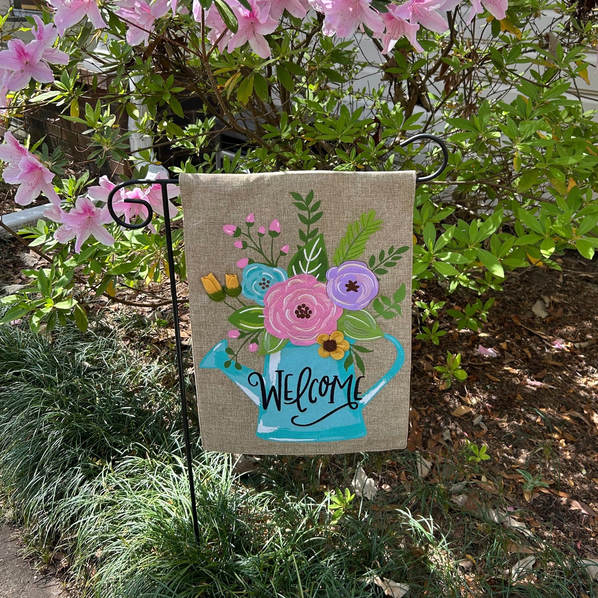 - Brightly colored and beautifully painted spring flowers in a blue watering printed on a high quality burlap flag