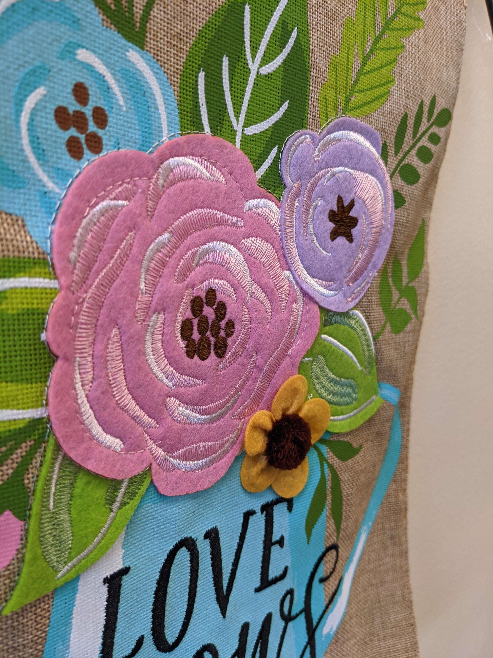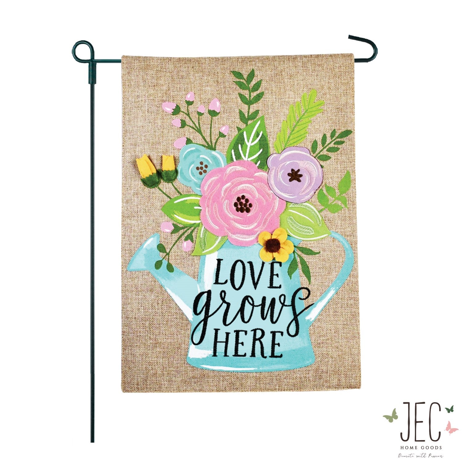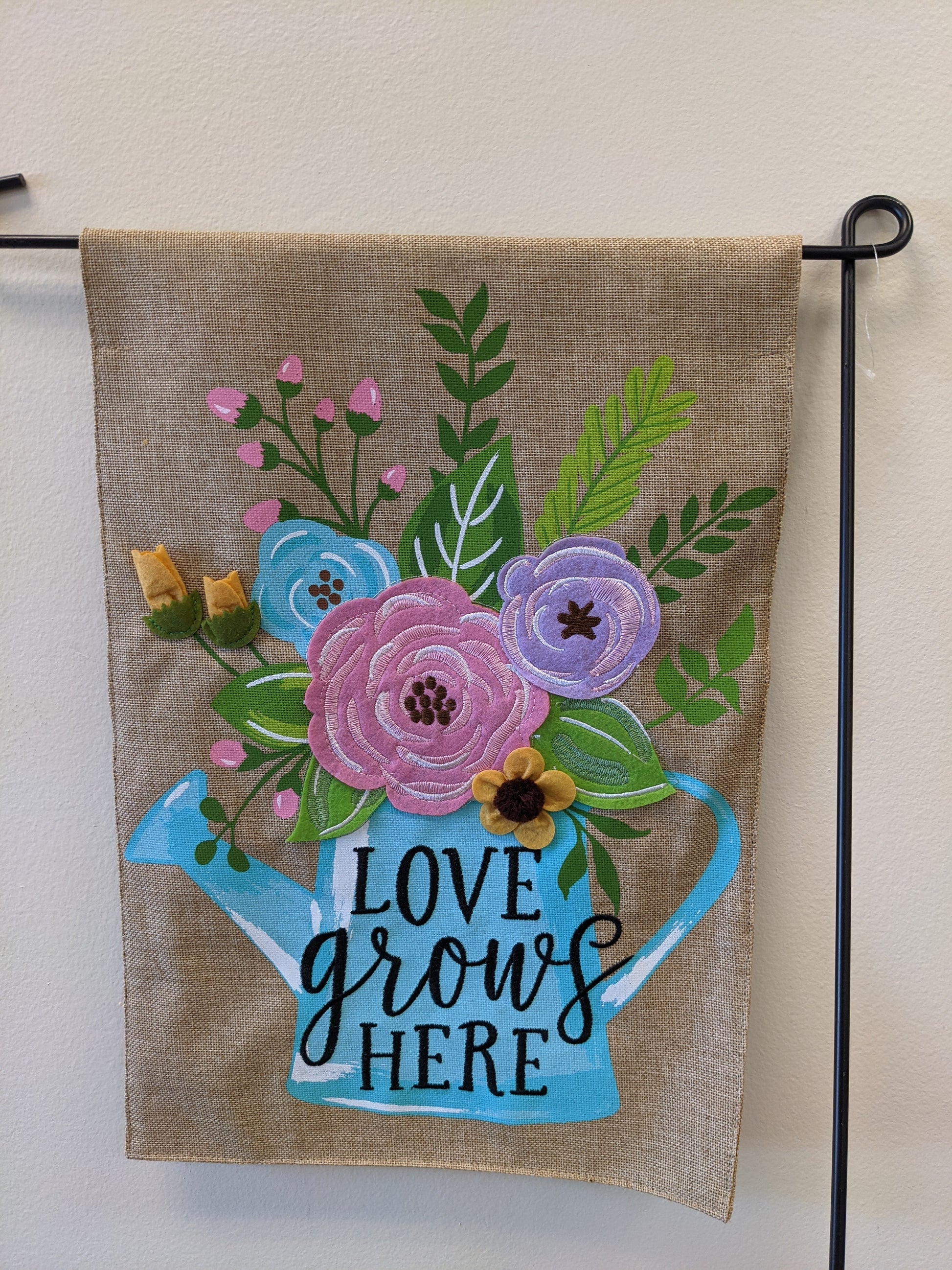 - Brightly colored and beautifully painted spring flowers in a blue watering printed on a high quality burlap flag