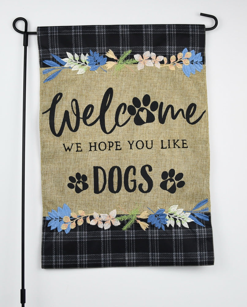 - "Welcome, We Hope You Like Dogs" is printed and embroidered